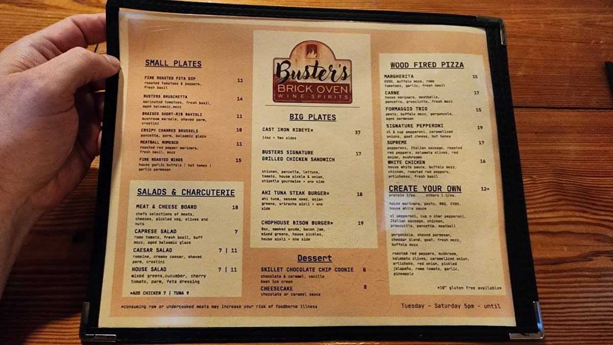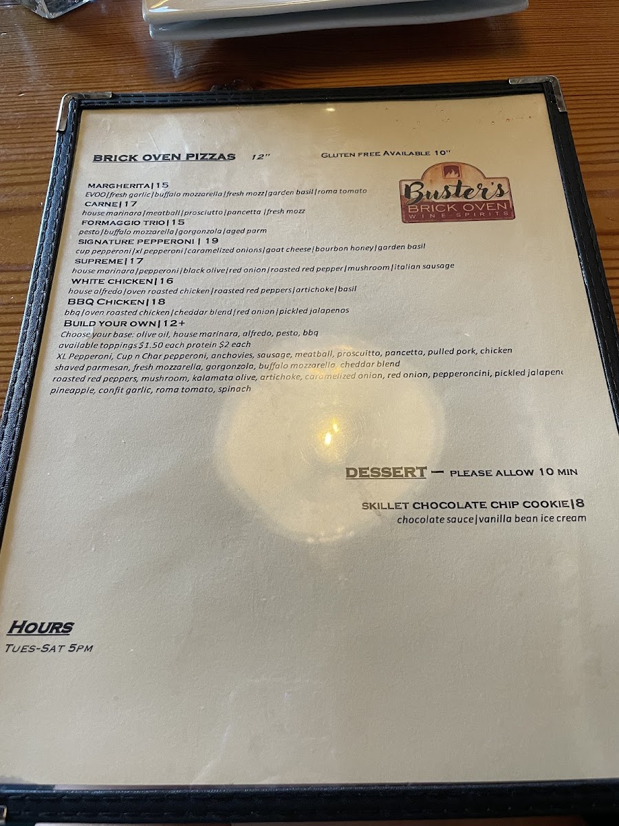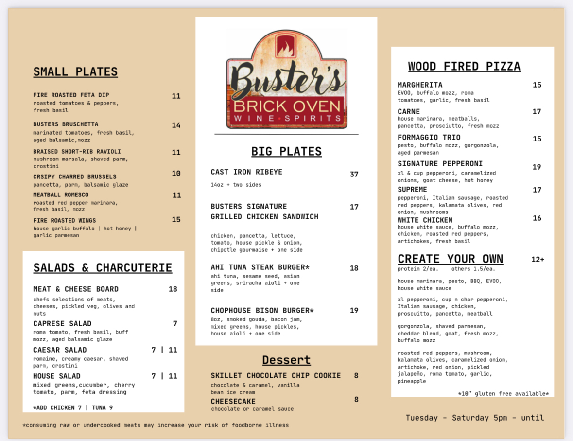 Buster's Brick Oven is a charming pizza restaurant located at 1715 Main St #4495, Daphne, AL. Known for its wood-fired pizzas, the menu features standout creations like the Signature Pepperoni XL and the savory White Chicken House. The mix of quality ingredients, including caramelized onions and buffalo mozzarella, elevates every bite. Beyond pizza, the menu offers big plates like Seared Tuna and a Chophouse Bison Burger, highlighting their culinary diversity.